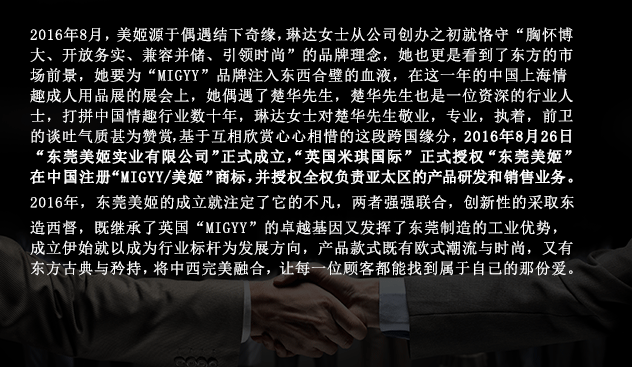 “MIGYY”英国品牌创始人是“Linda( 琳达)” ;“美姬”中国品牌注册商是“东莞美姬实业有限公司”。